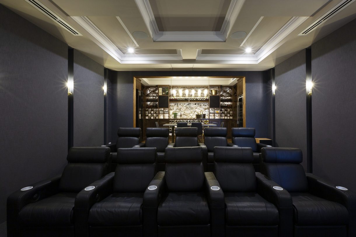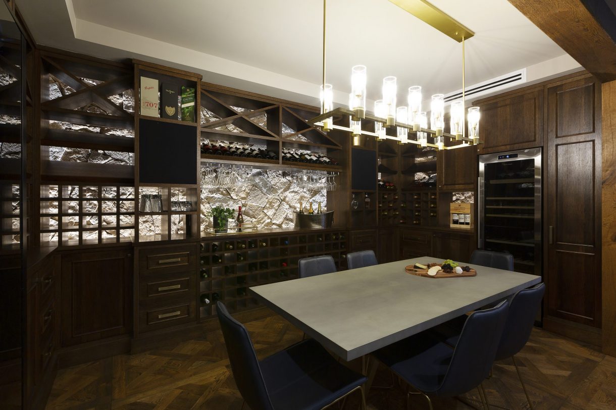 The heart of the house is centred around a six-metre void. Here, sunlight streams into the family room through a series of arched glass doors and circular windows. Another highlight, the wine cellar features a sandstone wall lit from the ground up.