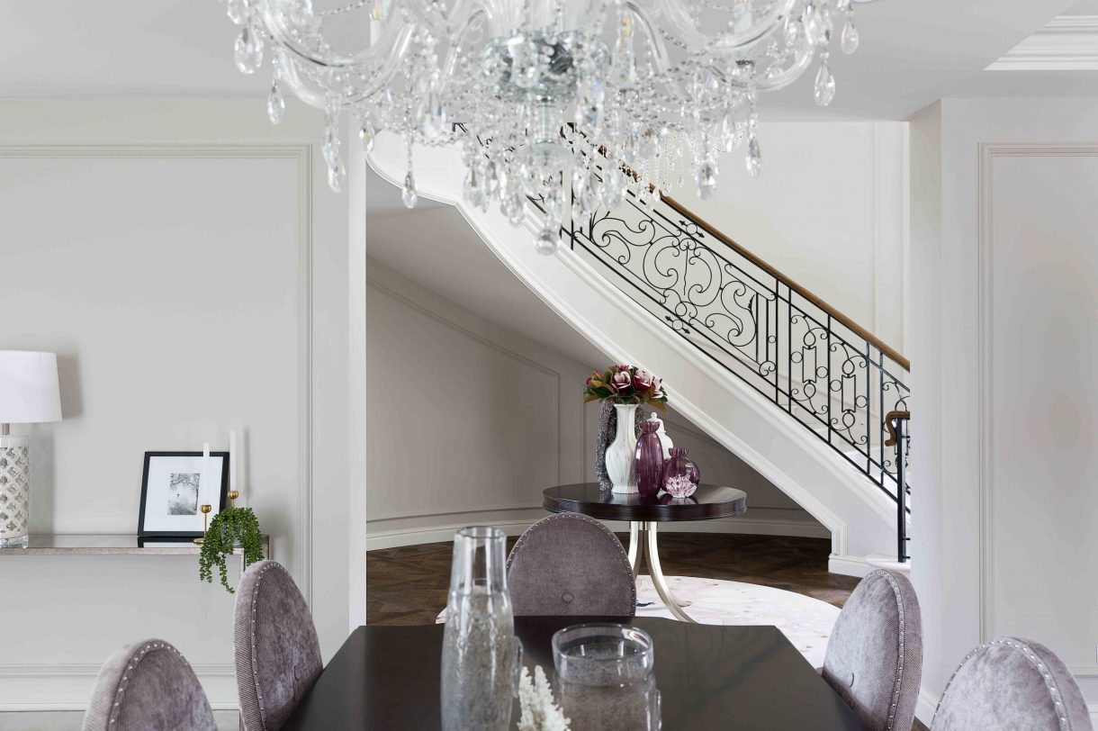 This French inspired home comprises five bedrooms, five bathrooms, a wine cellar, home theatre, swimming pool and 6 car garage. A study in symmetry centred around an arched entry, the façade commands attention and sets the tone for this exquisite family home.