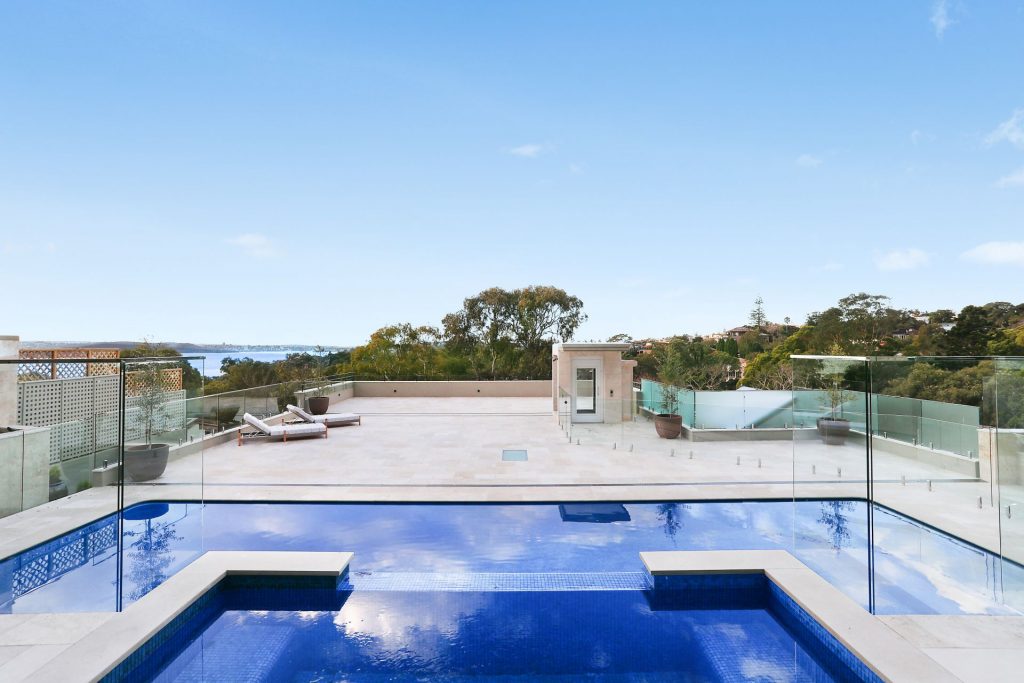 The elegant facade is an ode to Italy, with terracotta finishes, a beautifully columned entrance, and wrought iron accessories. Beyond an arched threshold and grand staircase, multiple living and entertaining spaces spill out onto sun-drenched terraces and private courtyards. Accessible by a glass lift, the rooftop terrace boasts landscaped gardens, an oversized pool and sweeping water views.